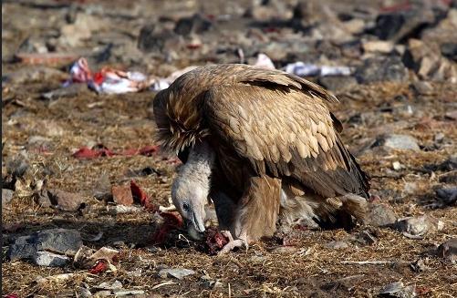 天葬台上桑烟引来的鹰鹫,除吃人尸体外,不伤害任何动物,藏人称之为“神鸟”。据说,如此葬法是效仿释迦牟尼“舍身饲虎”的行为,所以西藏至今仍流行天葬。