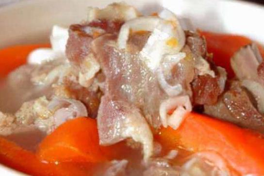 新鲜羊肉汤透明澄清,脂肪团聚于肉汤表面,具有羊肉特有的香味和鲜味。