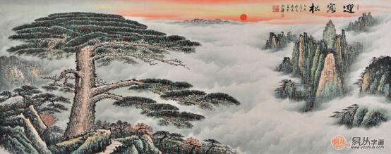 沙发背景墙挂什么画好?被赋予了迎福招财寓意的迎客松山水画也是相当不错的装饰之选。蒋伟老师的山水画黄山迎客松《松迎朝阳》,旭日东升,绵绵群山,轻烟淡峦,山势险峻,草木泽生,云烟浮动,云霞卷舒,洋溢着盎然生机,古松苍天笔挺,有君子之威风,是祈福之寓意。