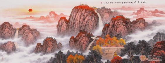国画泰山《旭日东升》装饰于厅、堂、室、所之上寓意着国泰民安行大愿、背靠(依)泰山得五福。更寓:不欺人、不欺天、不欺心之德!诚信之品、一诺岱岳!人康、家和、仕途、财源,稳如泰山、万代长青!