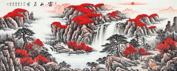 国画山水《富山居图》是蒋伟聚宝盆作品的又一幅鸿运风水画题材的山水作品。画面中的祥云高照代表鸿运当头,事业蒸蒸日上。流淌的瀑布代表着财源滚滚、生生不息的含义,充沛的水源汇流形成聚宝盆的形状,意味着水不外流,即财不外流,也就是招财聚宝盆。“鸿运当头”可寓国运兴旺昌隆,福泽千秋万代, 又可意家道运势,聚福纳财,百代兴旺。