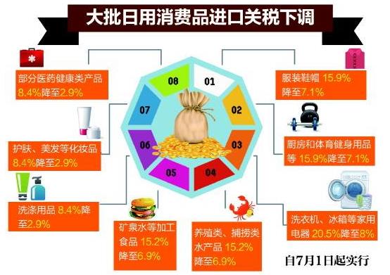 国务院常务会议日前决定,从今年7月1日起,将服装鞋帽、厨房和体育健身用品等进口关税平均税率由15.9%降至7.1%;将洗衣机、冰箱等家用电器进口关税平均税率由20.5%降至8%;将养殖类、捕捞类水产品和矿泉水等加工食品进口关税平均税率从15.2%降至6.9%;将洗涤用品和护肤、美发等化妆品及部分医药健康类产品进口关税平均税率由8.4%降至2.9%。