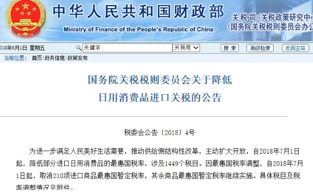 中国国务院关税税则委员会5月31日发布公告,自2018年7月1日起,降低日用消费品进口关税。