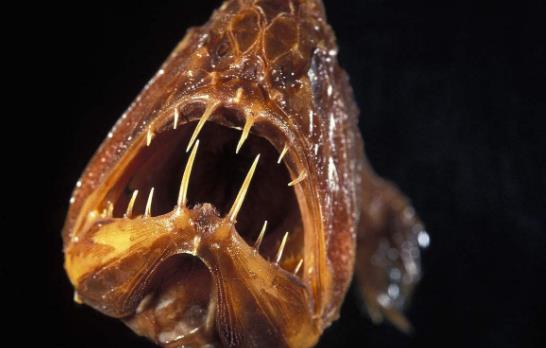 它是又一种长着骇人脸庞的深海暗杀者,同时也是海底最深处的居民之一,它们被发现生活在海底5千米以下的黑暗环境里。尖牙鱼属于金眼鲷目,中文名也叫角高体金眼鲷。它因牙大而得名,它脑袋上左右两颗最大的牙齿简直太大了,以至于造物神不得不在其微型的脑子左右两侧各留出一个“插槽”,以便其大嘴能够合上。相对于其体型来说,它的牙齿可能是海洋鱼类中最大的,因此有些体型比它们庞大的鱼类也成了其盘中餐。超大号的犬牙配上肌肉发达的腭,样子看起来深具威胁性,可怕的外表让它得到“食人魔鱼”这样恐怖的英文名字。