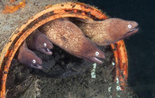 海鳝(Muraenidae),分布于热带和亚热带海洋,生活于浅水,栖于岩礁间并隐在缝穴内。与其他鳗类不同之处是鳃孔小而圆,一般无胸鳍。海鳝科是80多种鳗类的统称。分布于热带和亚热带海洋,生活于浅水。它们一般躲藏在礁石的缝隙里,伺机捕食。海鳝有着一张大嘴和锋利的牙齿,它们以海洋生物为食。不过,如果有人类离它们太近,也会遭到它们的攻击。海鳝体长一般不超过1.5公尺(5尺),但太平洋的长体海鳝可长约3.5公尺(11.5尺)。在世界上某些地区人们食海鳝的肉,但某些种类有毒,可引起疾病和死亡。尽管我们不想和这些骇人的怪物有任何联系,但从生物进化的角度上看,我们这些脊椎动物却和他们是远亲.