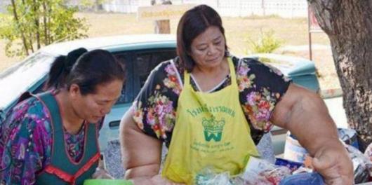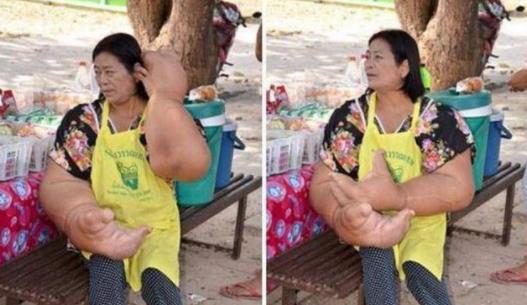 看到上面的图片了吗?图片中人就是一位来自泰国的59岁的女子,这胳膊粗的真的不想话了,比起人的腰还粗,这也正是因为她患上了一种罕见的“巨臂症”的原因,我想如果去申请吉尼斯世界纪录的话,世界上最大的手、世界上最粗的手臂称号绝对是非她莫属了。