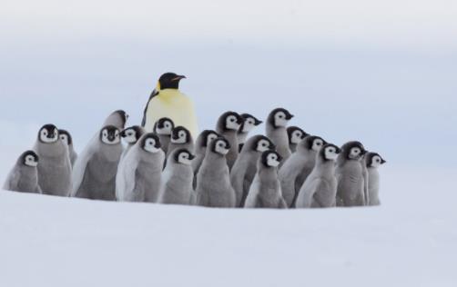 帝企鹅(学名:Aptenodytes forsteri):也称皇帝企鹅,是企鹅家族中个体最大的物种,一般身高在90厘米以上,最大可达到120厘米,体重可达50千克。其形态特征是脖子底下有一片橙黄色羽毛,向下逐渐变淡,耳朵后部最深。全身色泽协调。颈部为淡黄色,耳朵的羽毛鲜黄橘色,腹部乳白色,背部及鳍状肢则是黑色,鸟喙的下方是鲜桔色。帝企鹅在南极严寒的冬季冰上繁殖后代,雌企鹅每次产1枚蛋,雄企鹅孵蛋。雄帝企鹅双腿和腹部下方之间有一块布满血管的紫色皮肤的育儿袋,能让蛋在环境温度低达零下40摄氏度的低温中保持在舒适的36摄氏度。