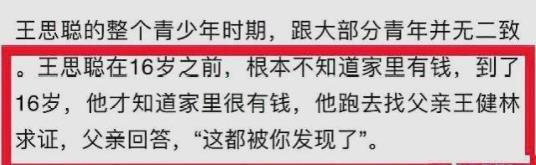 文章其中一段提到了王思聪的青少年时期,称他在16岁的时候才知道自己家里很有钱,去问了父亲王健林,王健林回答道“这都被你发现了”。