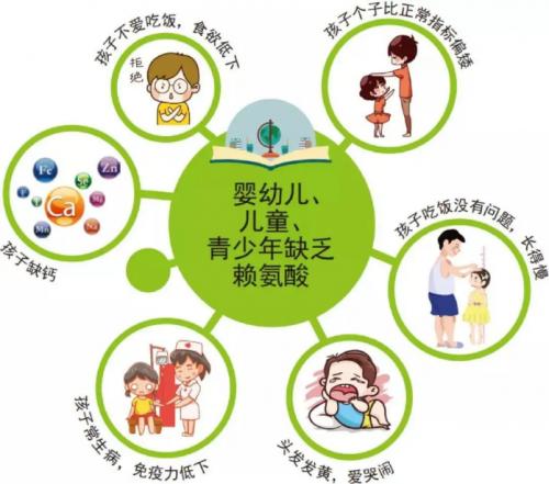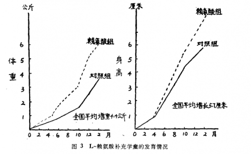 1964年,日本在全国许多地区学校午餐提供赖氨酸强化面包,1年后检查体重、身高,结果强化组比全国平均体重增加4.4Kg,身高增加5.7cm,且显著改善蛋白质缺乏现象,感冒发病率大大下降。日本还曾对6对1-3岁双胞胎进行为期1300天 实验,试验组每天在牛奶中添加0.5g赖氨酸,结果体重比对照组体重多1Kg,身高长7cm,智商高9.5。
