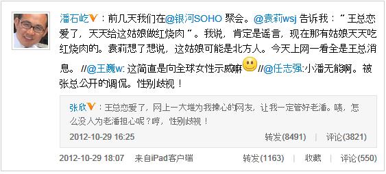 今日下午16时25分,SOHU中国CEO张欣发表微博称,“王总恋爱了,网上一大堆为我操心的网友,让我一定管好老潘。啧,怎么没人为老潘担心呢?哼,性别歧视!”随后,任志强(知名地产商)转发该条微博并调侃道,“小潘无能啊。被张总公开的调侃。性别歧视!”