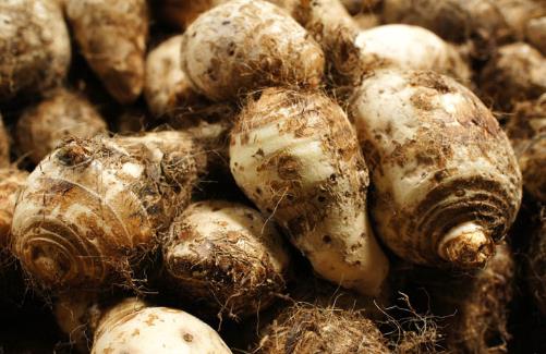 芋头又称芋、芋艿,天南星科植物的地下球茎,形状、肉质因品种而异,通常食用的为小芋头。多年生块茎植物,常作一年生作物栽培。叶片盾形,叶柄长而肥大,绿色或紫红色;植株基部形成短缩茎,逐渐累积养分肥大成肉质球茎,称为“芋头”或“母芋”,球形、卵形、椭圆形或块状等。母芋每节都有一个脑芽,但以中下部节位的腋芽活动力最强,发生第一次分蘖,形成小的球茎称为“子芋”,再从子芋发生“孙芋”,在适宜条件下,可形成曾孙或玄孙芋等。