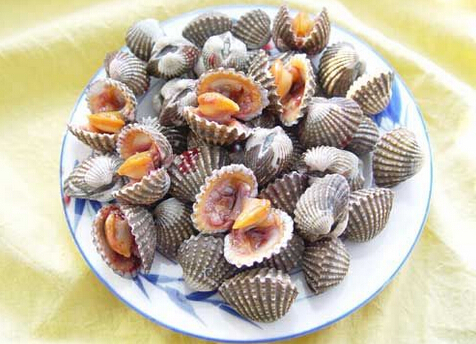 2、将炒锅置旺火上,舀入清水烧沸,放入蚶子略烫,并翻动几下,在蚶壳欲开时捞出,剥去半边壳,探放在盘中;