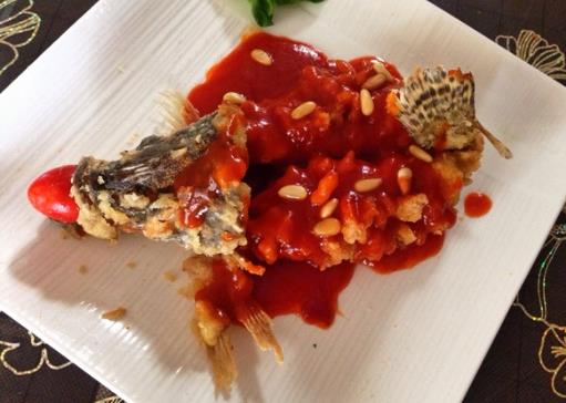 将鳜鱼刮鳞、去鳃、挖出内脏,并用刀在鱼的两边划上若干个“人”字形,再将鱼放入沸水里烫一下(除去腥味)沥水晾干后,在锅中放较多油,中火把鱼炸熟成金黄色后装盆。然后在锅中放入半碗水,水开后放盐、酱油、糖、姜末,最后加醋,并用水淀粉勾芡成浓汁,浇在鱼上,并撒上适量的熟松子后,即可。