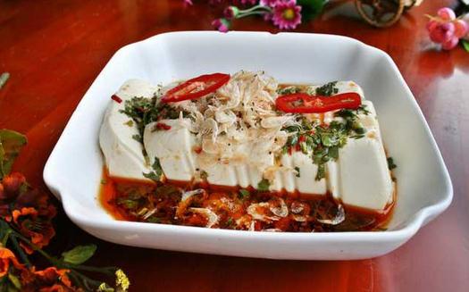 4)用蒸豆腐流出的汁水,加一些辣酱,拌匀,浇在酿好的豆腐上,撒熟芝麻。
