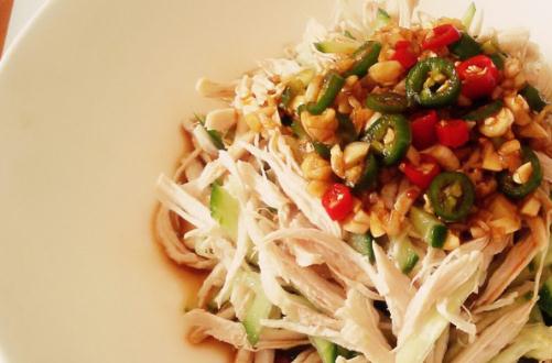 6、鸡肉起锅,用手撕成丝,将其与青红椒丝和黄瓜一同放入冰箱1小时,这样吃起来更爽口;