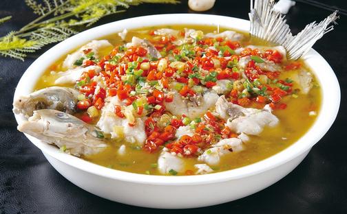 炒锅再加油烧热后,把泡红椒碎和大蒜碎炒香后铺在鱼肉面上,再撒上些花椒粉(也可不用),撒上葱段即可,美味的酸菜鱼就做好了。